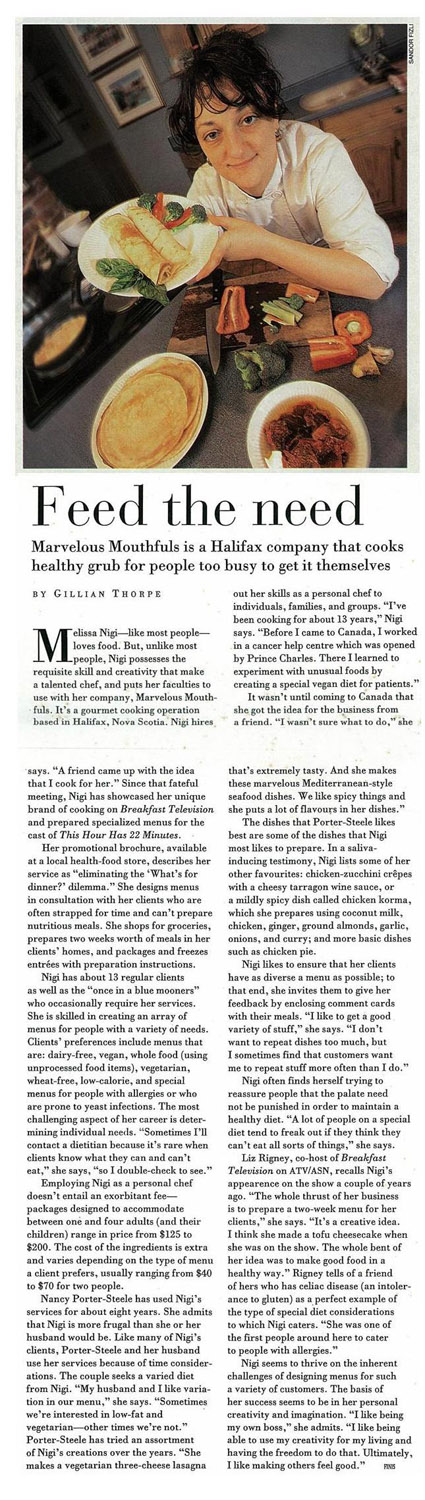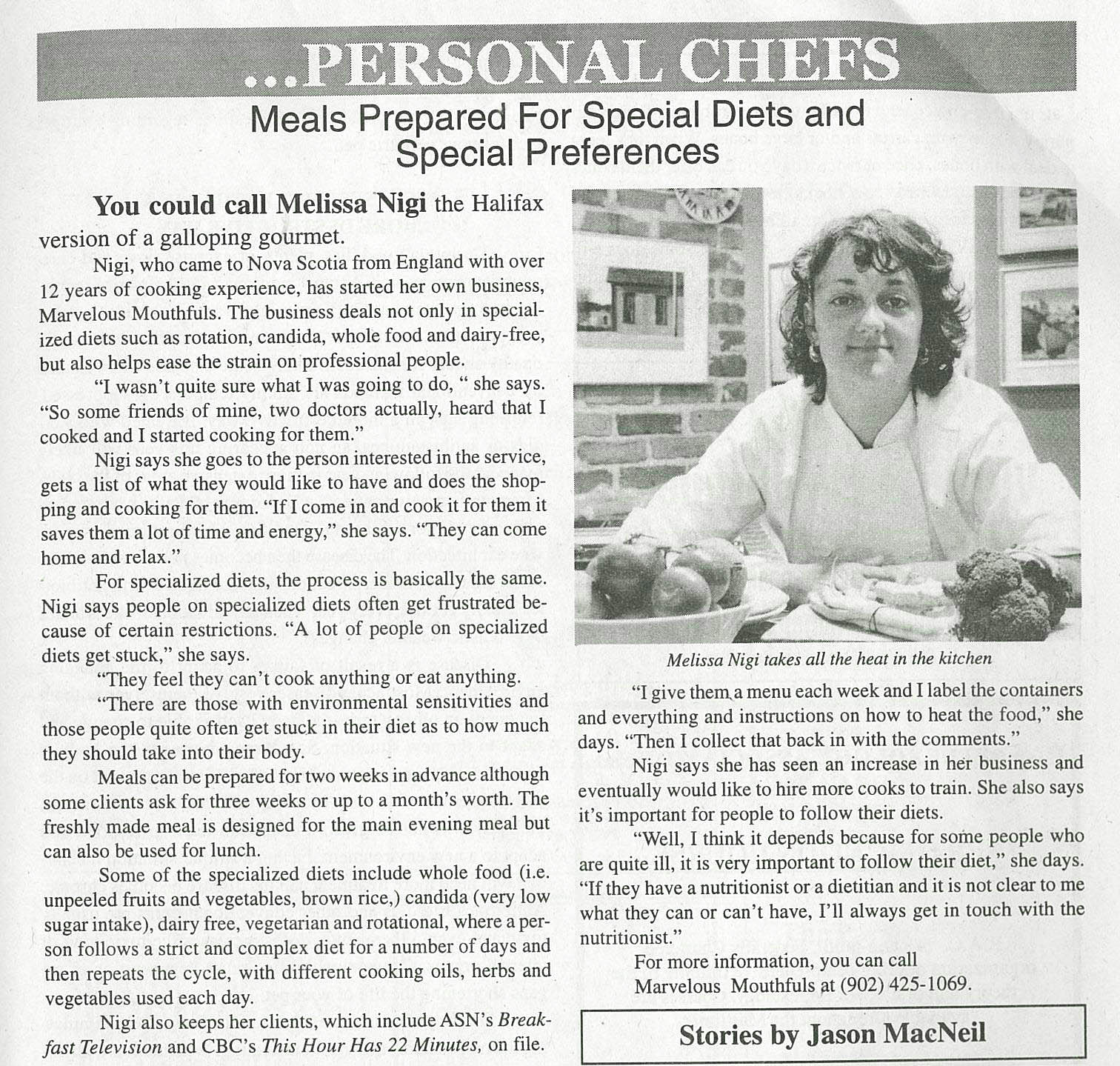 The Source - Maritimes Holistic Health Journal Halifax, Nova Scotia August 1997 "Meals Prepared for Special Diets and Preferences" |